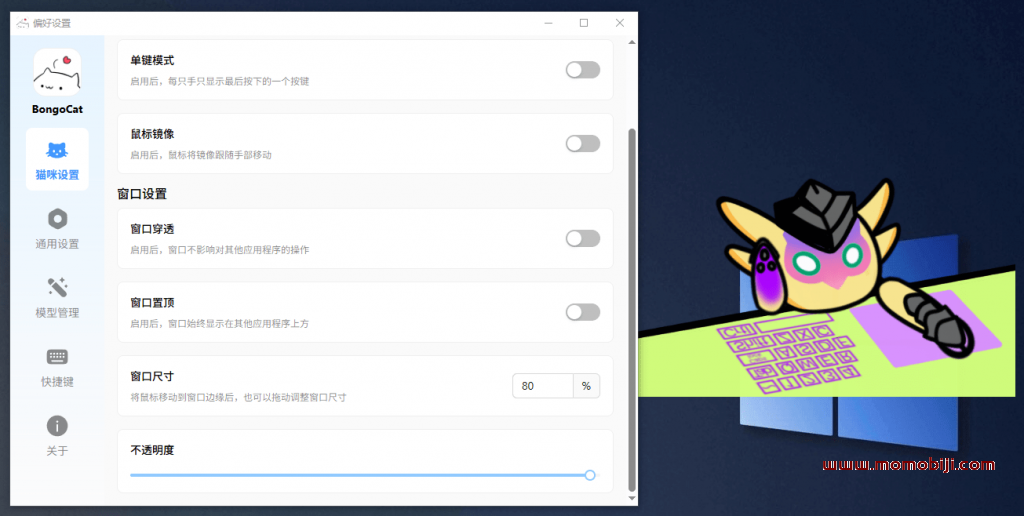 BongoCat —— 一个基于 Tauri 开发的跨平台桌面应用程序,主要提供一只可爱的猫咪形象,可根据用户的键盘或鼠标操作进行互动。在前段其实分享过这款工具,但是是经过修改的老版本,只支持win系统,所以此次在发一次文章,因为现在模型可以直接拖动导入,新增了些可爱皮肤,也支持全平台使用了。