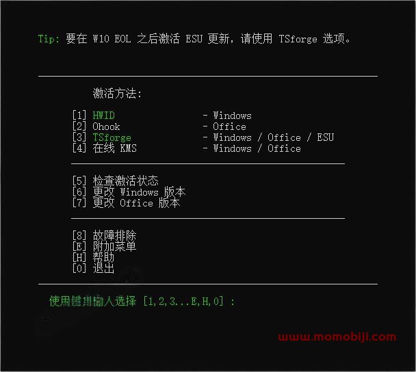- 软件内,有4种激活方法,针对windows的激活有HWID、TSforge、在线KMS